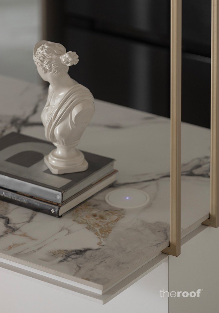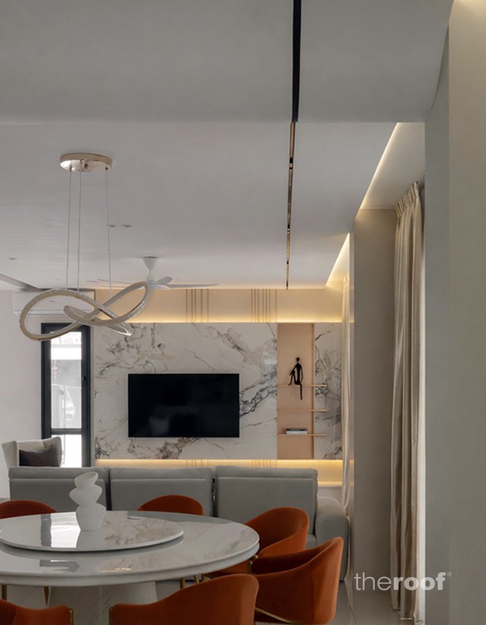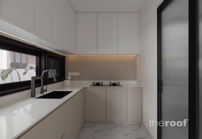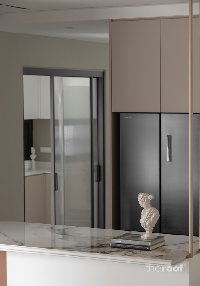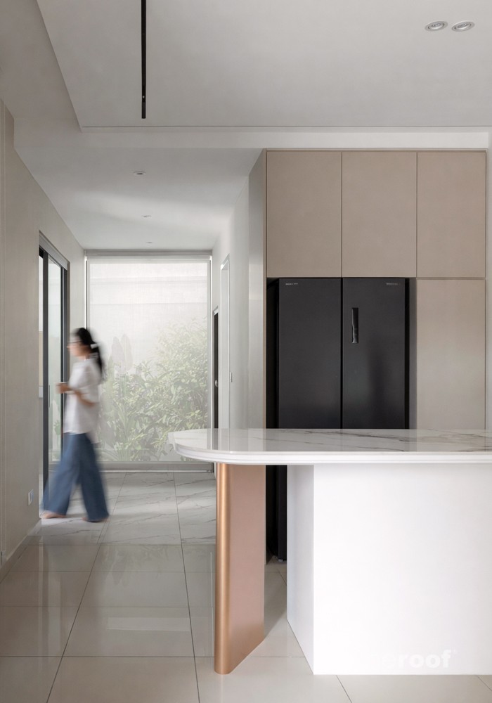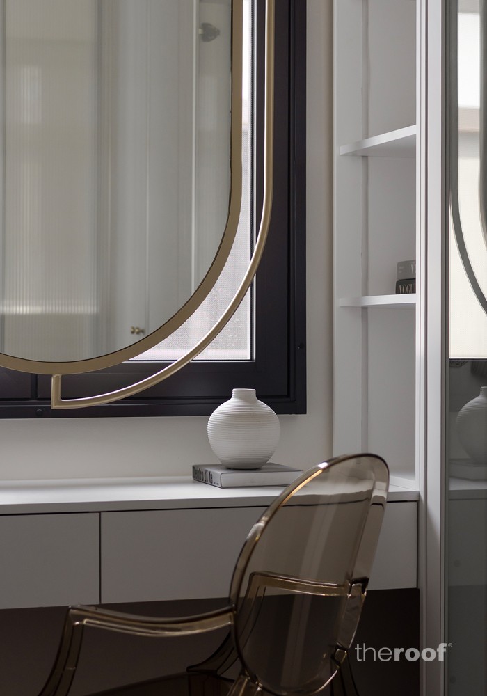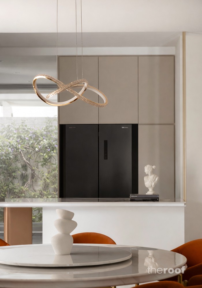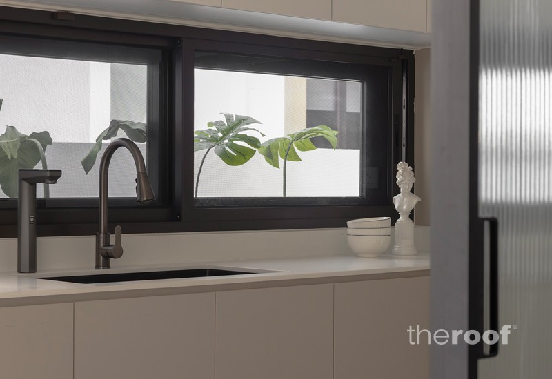 Curved lines and minimal detailing enhance the sense of elegance, while a thoughtfully designed curved ceiling discreetly conceals existing beams and adds a soft continuity throughout the space. To further elevate the bright and welcoming atmosphere, a large landscape window was purposely installed to fill the interior with abundant natural light.