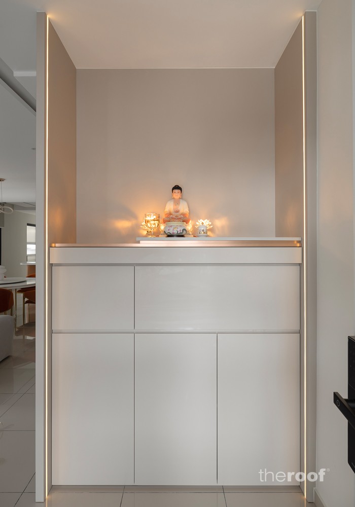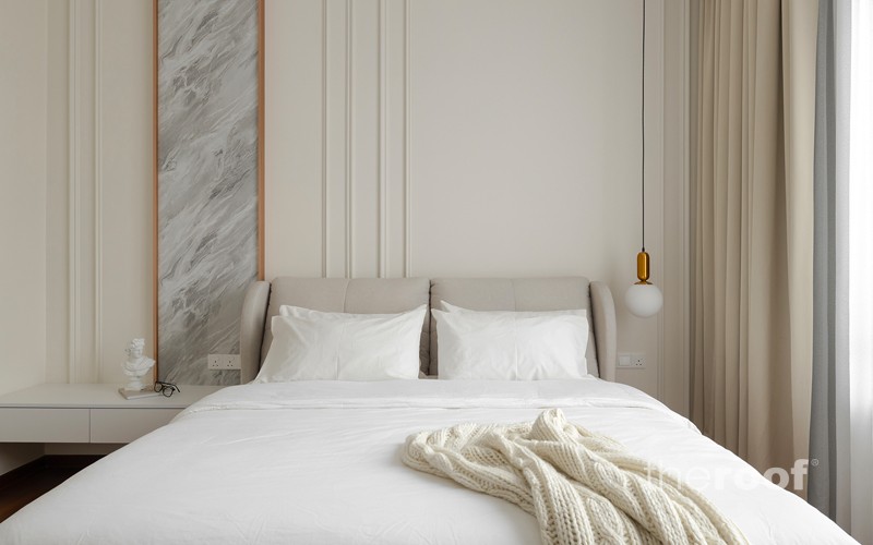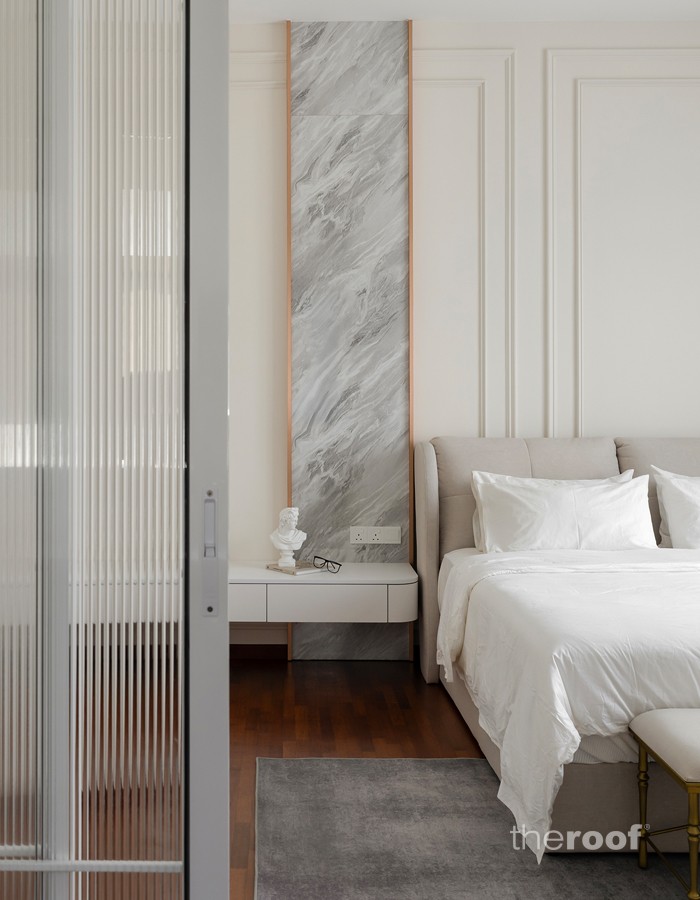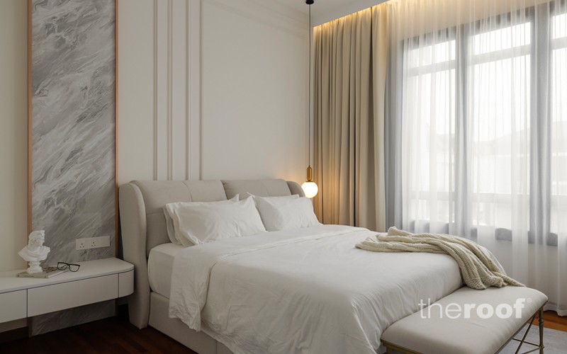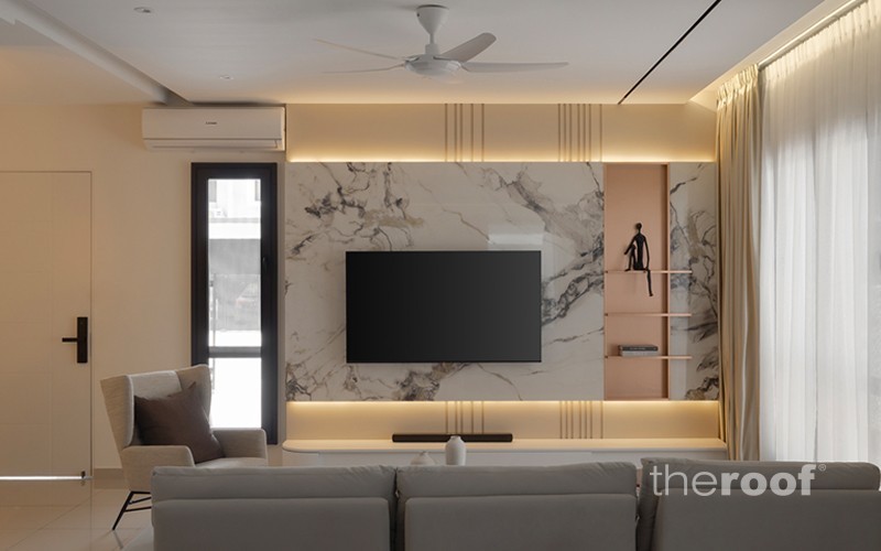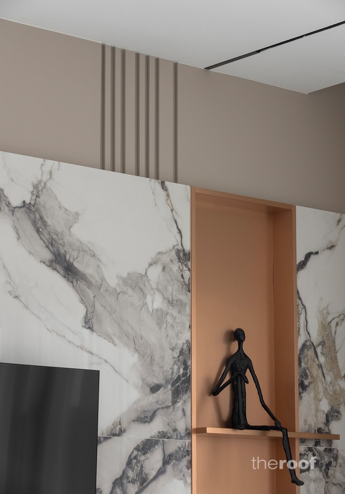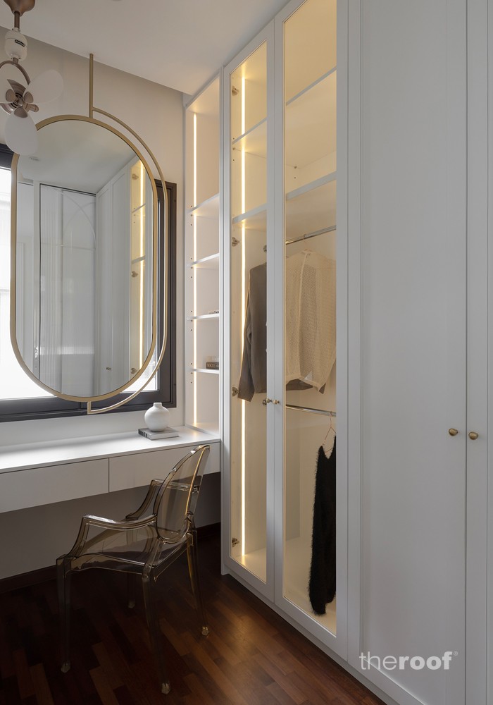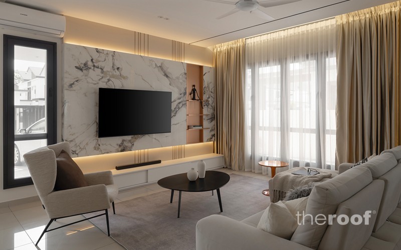 Curved lines and minimal detailing enhance the sense of elegance, while a thoughtfully designed curved ceiling discreetly conceals existing beams and adds a soft continuity throughout the space. To further elevate the bright and welcoming atmosphere, a large landscape window was purposely installed to fill the interior with abundant natural light.