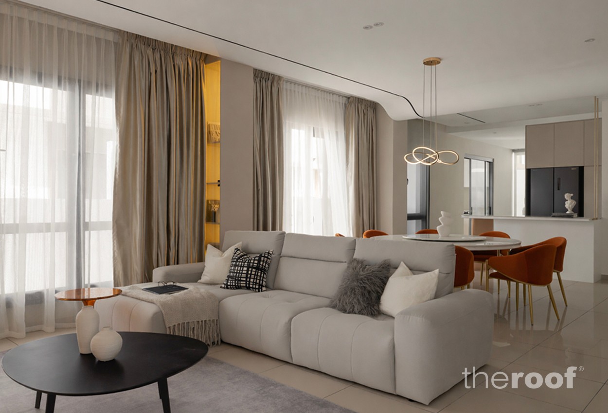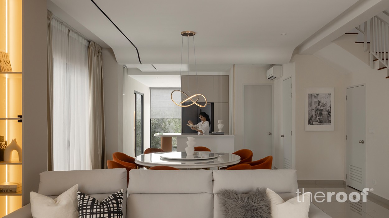 This home features a refined neutral palette and a contemporary aesthetic, with a strong emphasis on natural sunlight, openness, and subtle contrast. The open-plan layout seamlessly connects the living, dining, and kitchen areas, creating a fluid and functional living environment.